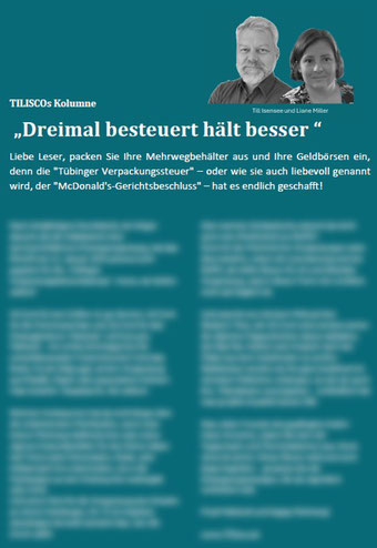 Kolumne TILISCOS KOLUMNE – „Dreimal besteuer hält besser“ Liebe Leser, packen Sie Ihre Mehrwegbehälter aus und Ihre Geldbörsen ein, denn die "Tübinger Verpackungssteuer" – oder wie sie auch liebevoll genannt wird, der "McDonald's-Gerichtsbeschluss" – hat es endlich geschafft! Tiliscos Kolumne "Verpackungssteuer" TILISCOS KOLUMNE Verpackungssteuer.pdf Adobe Acrobat Dokument 158.3 KB Download tagPlaceholderTags: PPWR, verpackungssteuer, PPWRCheck, PPWRTool Kommentar schreiben Kommentare: 0